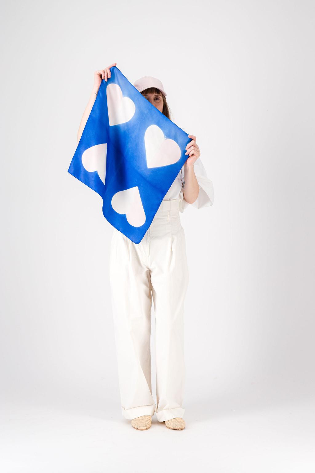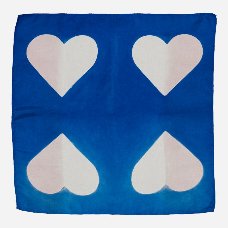 « LOVE », un foulard en soie au motif as de cœur, créé en teinture artisanale.