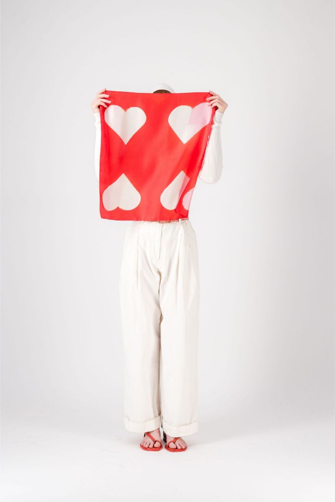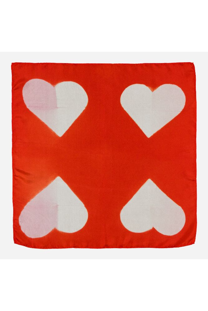 « LOVE », un foulard en soie au motif as de cœur, créé en teinture artisanale.
