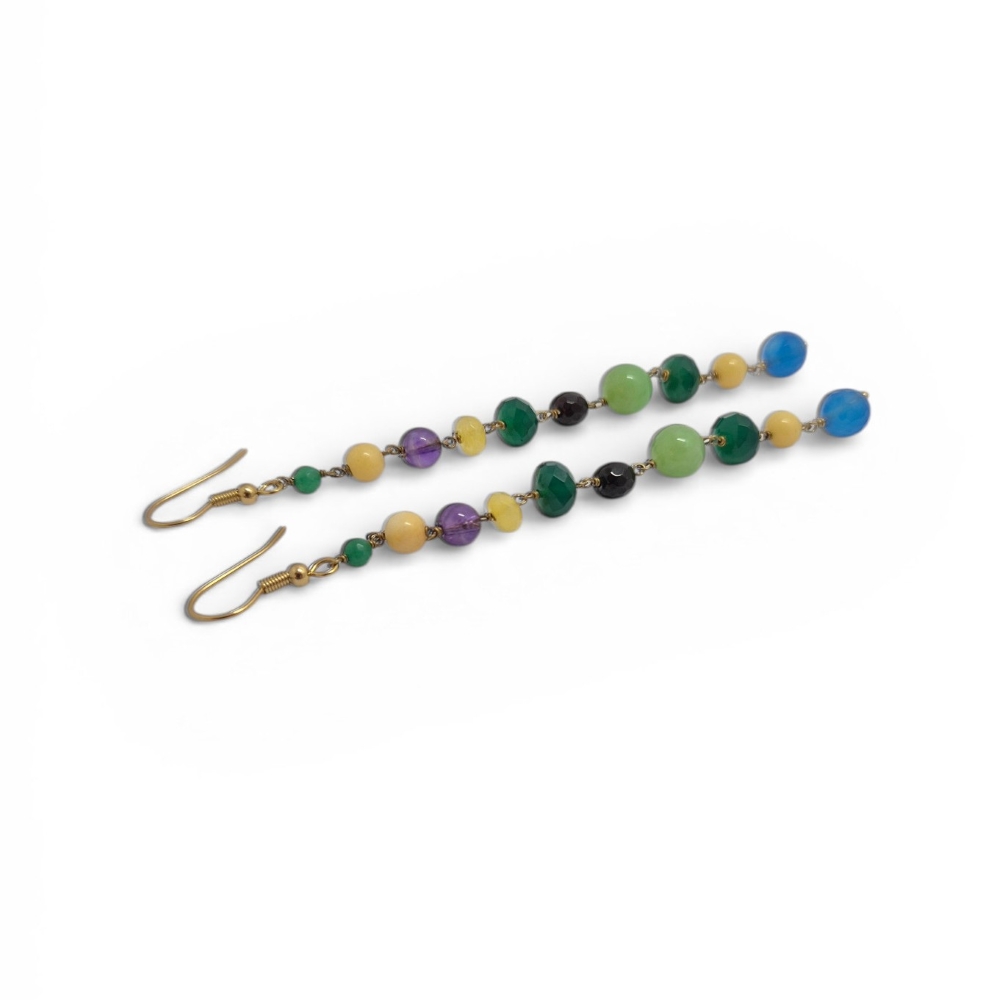 Longues boucles d’oreilles en pierres fines de différentes couleurs – bleu, vert, jaune, violet