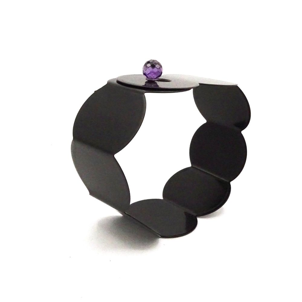 Bracelet en aluminium laqué noir avec un fermoir doté d’une améthyste.