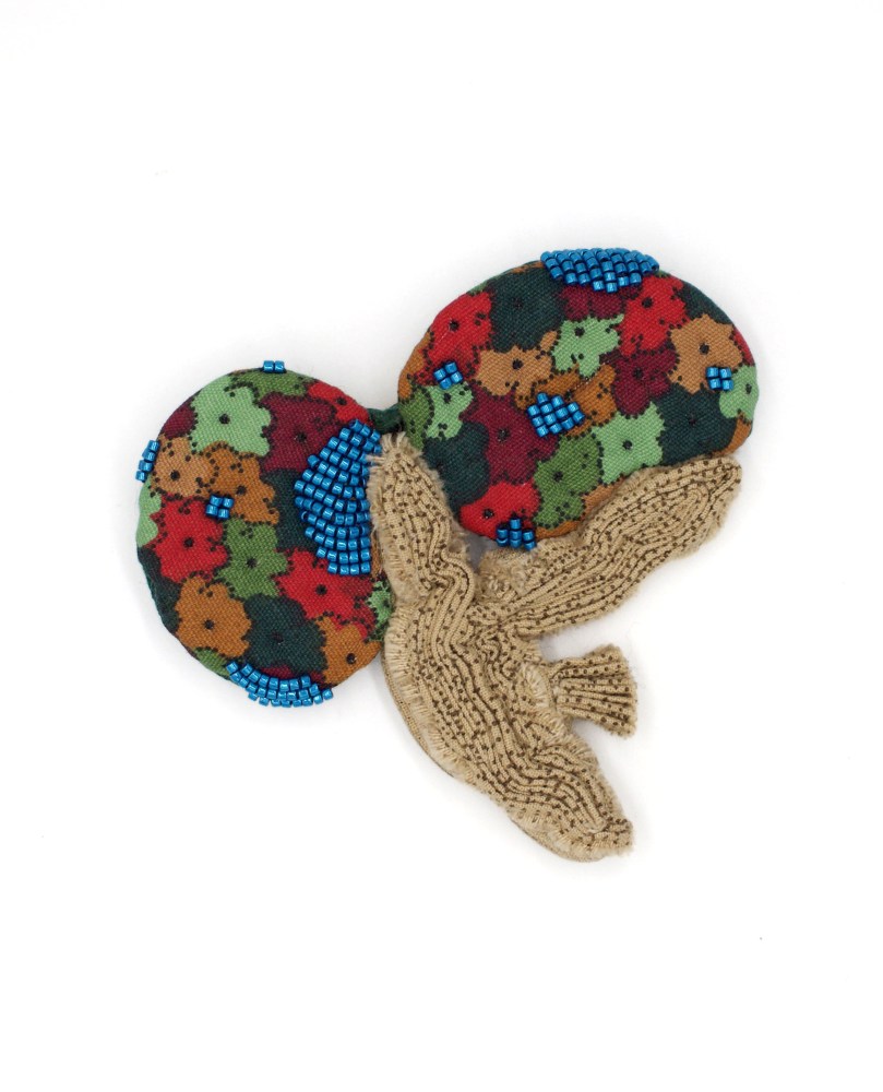 Broche en toiles imprimées et plissées et broderies de perles bleu métallisé.