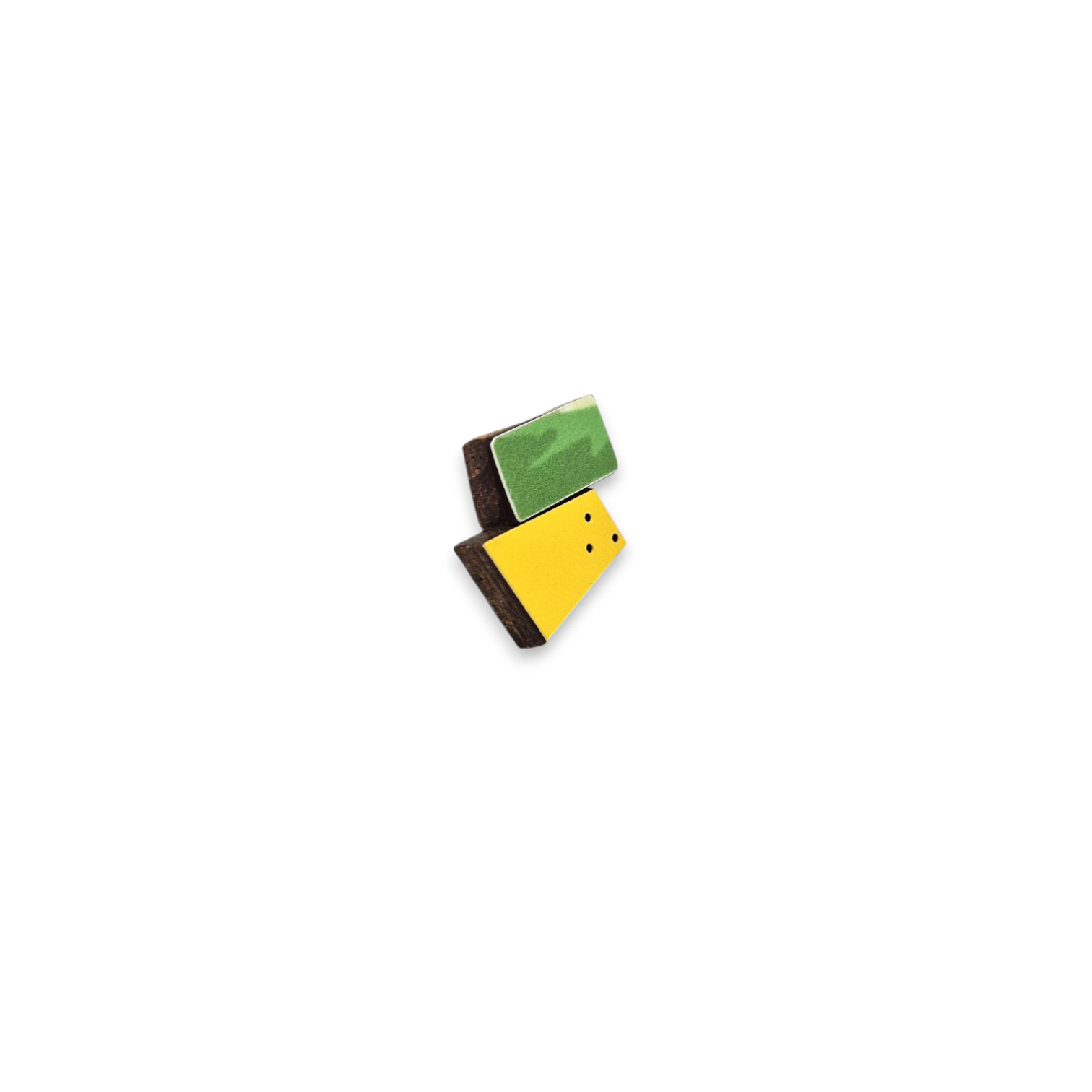 Petite broche en bois et formica jaune avec perforations et vert à motifs.