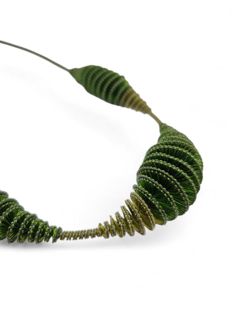 Sautoir en matière textile vert mousse et vert foncé, bords contrastés.