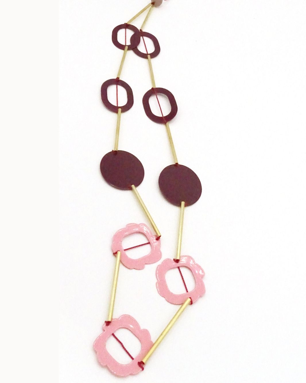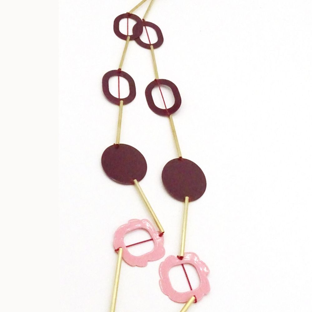Sautoir en laiton, aluminium laqué rose et prune, fil de soie bordeaux et une agate grise.